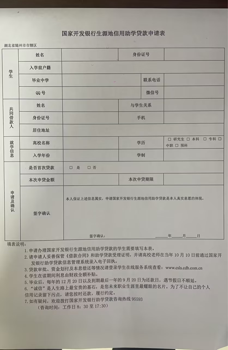 (1)網(wǎng)上申請:登錄國家開發(fā)銀行生源地信用助學貸款信息系統(tǒng)(https://sls.cdb.com.cn/),填寫《國家開發(fā)銀行生源地信用助學貸款申請表》,從系統(tǒng)導出并打印(未通過預申請學生同時在系統(tǒng)內導出并打印《家庭經濟困難學生認定表》),填寫并簽字(不需要認定單位出具認定意見和加蓋公章)。