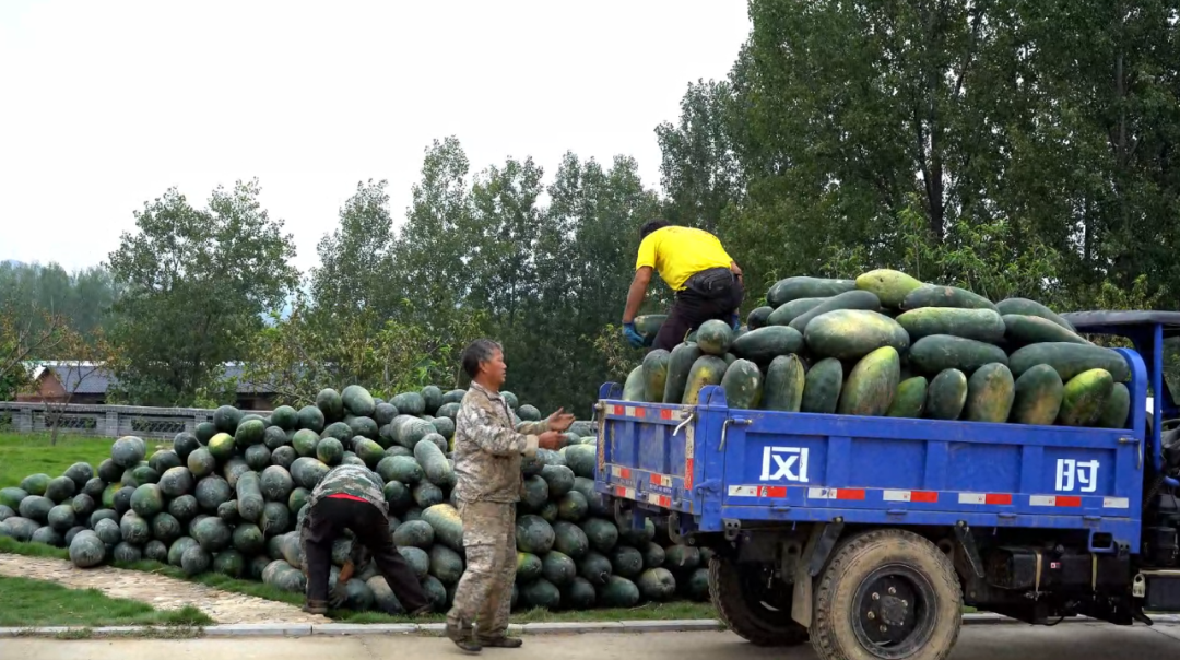 大冬瓜,被稱為這個夏天最火的消暑神器。記者在現場看到,種植大戶周超正帶領村民在坡崗地里采摘冬瓜。大家肩扛手抬,將一個個沉甸甸的冬瓜裝進農用三輪車。車子沿著蜿蜒的鄉村小道,將冬瓜運往村委會旁的臨時堆放點。綠油油的草坪上,冬瓜整齊排列,仿佛在靜靜等待下一步的“旅程”。據介紹,每畝冬瓜地至少有1萬斤的產量,像這樣的農用三輪,每天至少要拉20車。