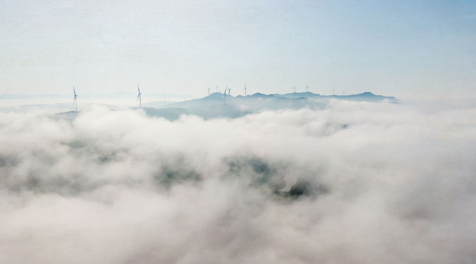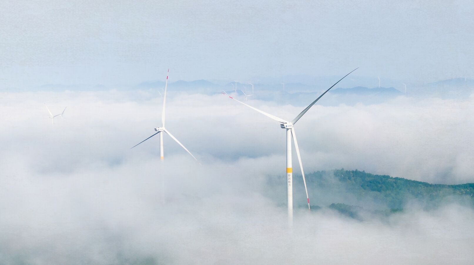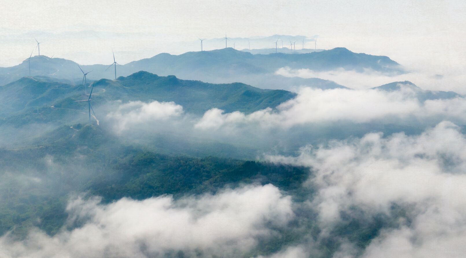 人間五月,春色正濃。湖北省隨州市隨縣高城鎮三家寨風電場風力發電機組矗立在高山草甸之上,點綴在藍天白云間,微風吹來,云霧彌漫,宛如朦朧仙境,壯美如畫。
