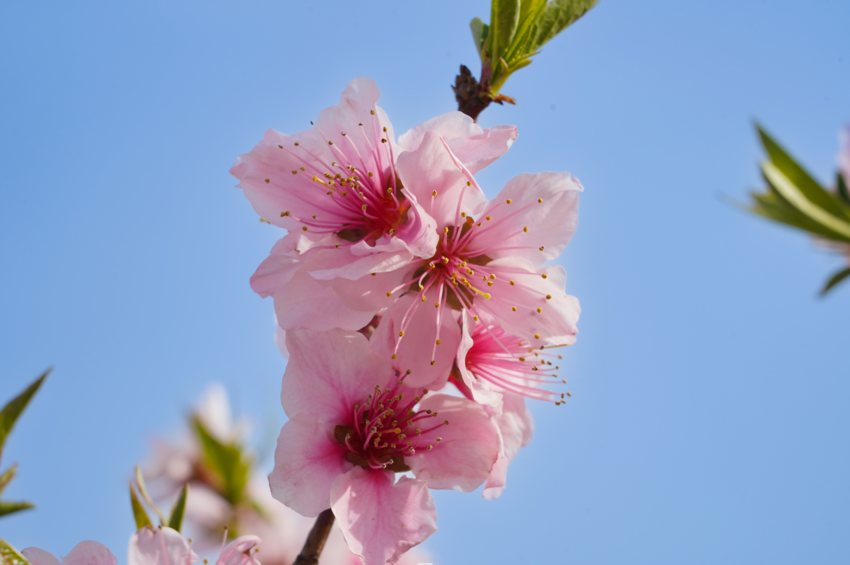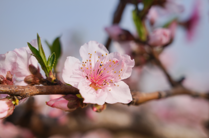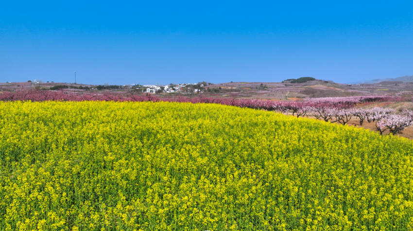 不論是遠眺還是近觀,無需刻意而為,粉白相間的俏麗嫵媚,與青山、村莊相映成趣,花美,景更美。