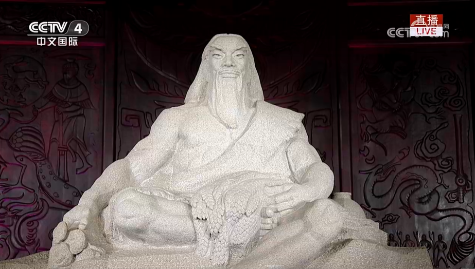 王蒙徽緩步上前,面向圣殿鞠躬后,推動“扶犁”。大殿圣門緩緩開啟,炎帝神農圣像顯現在海內外炎黃子孫面前。現場行“三獻禮”,以“享酒”“五谷”“玉帛”祭祀炎帝。