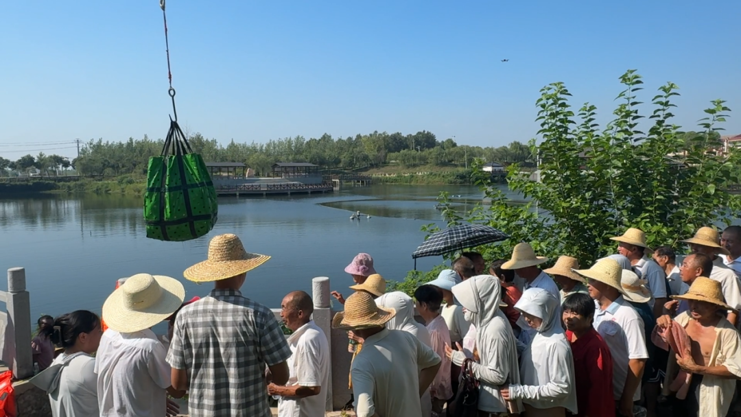 “起魚啰……”一大早,隨著捕魚人一聲吆喝,村民們拿著板凳陸續來到集體魚塘,開心地等待著撒網起魚。 當漁網行進到魚塘中間時,由于空間不斷縮小,不時有草魚、鰱魚相繼跳出水面,發出此起彼伏的拍水聲。